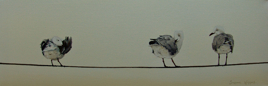 Early in the golden light of dawn, little grey seagulls love to do Palates and preen their feathers whilst twisting their little bodies into interesting knots. SIZE: 300MM X 900MM