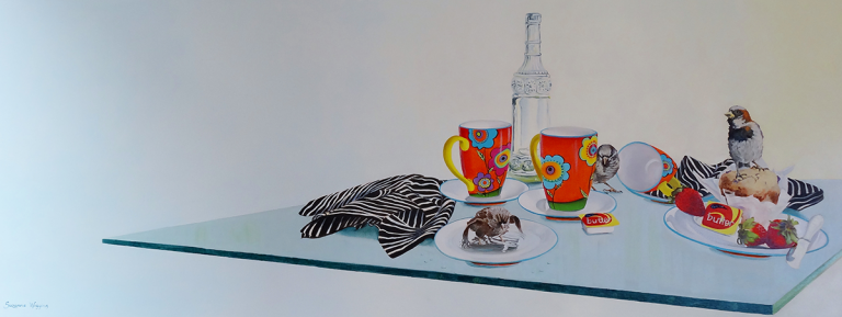 A contemporary twist on the urban Café scene; mischievous little sparrows descend on an abandoned table to feast on the spoils.